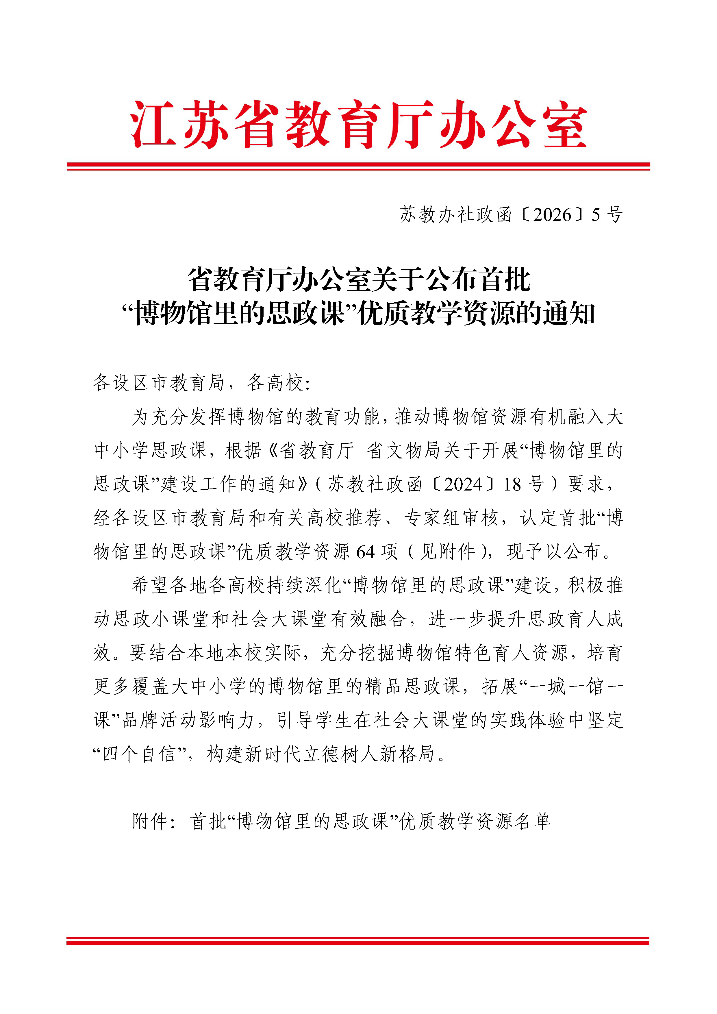 本次评选由江苏省教育厅、江苏省文物局组织,旨在深入贯彻落实习近平总书记关于“博物馆建设要更完善、更成体系,同时发挥好博物馆的教育功能”的重要指示精神,推动博物馆资源有机融入大中小学思政课一体化建设,促进思政小课堂与社会大课堂深度融合,共评选出优质教学资源64 项。